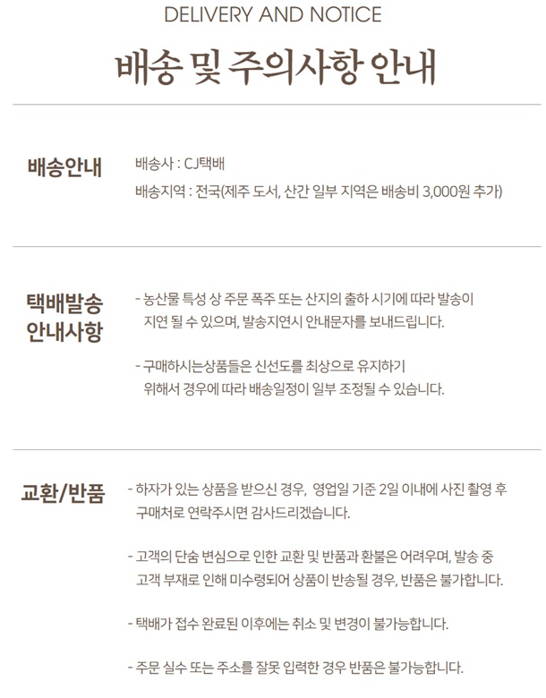 · 구매자가 배송지 주소를 잘못 기입한 경우, 반송/재발송 모두 택배비를 부담하셔야 합니다. (꼭 정확한 주소를 기입해 주세요)